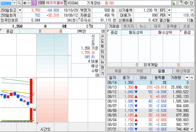 8월 13일 거래량은 2598만주 가량을 기록하며, 29.81% 오른 1350원의 상한가로 종가 마감하였습니다.