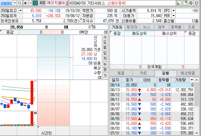 8월 13일 거래량은 약 1230만주 가량이며, 29.91% 오른 20850원의 상한가로 종가 마감하였습니다.