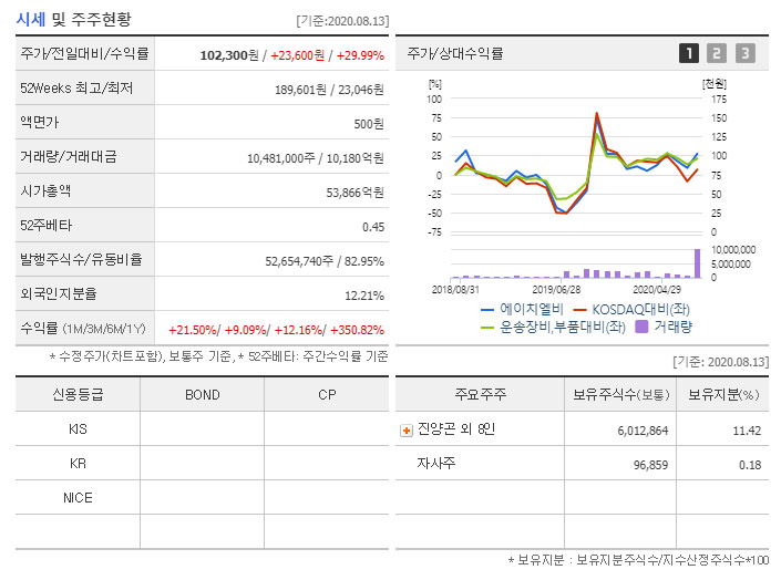 8월 13일 거래량은 1048만주 가량이 거래되며, 29.99% 오른 102300원의 상한가로 종가 마감하였습니다.