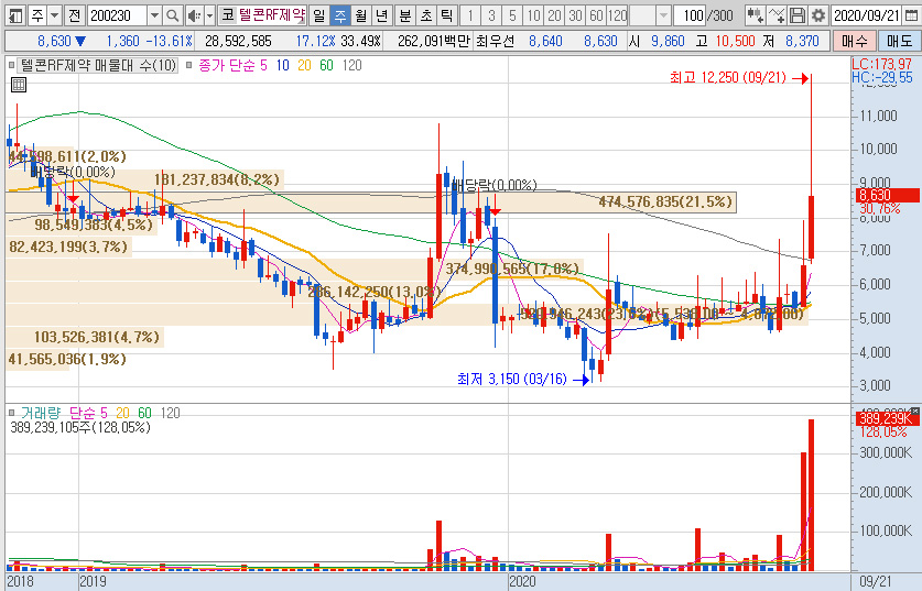 250일 최고가는 2020년 9월 24일 기록한 12,250원이고, 250일 최저가는 2020년 3월 19일 기록한 3,150원으로 최저가 대비 현 주가는 174.60% 상승한 수치입니다.