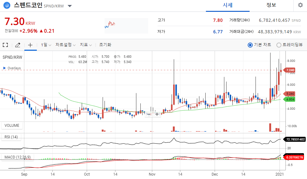 현재 업비트 24시간 거래량 기준 484억원 가량으로, 업비트 거래대금 순위 5위에 랭크되어 있는 스펜드코인입니다.