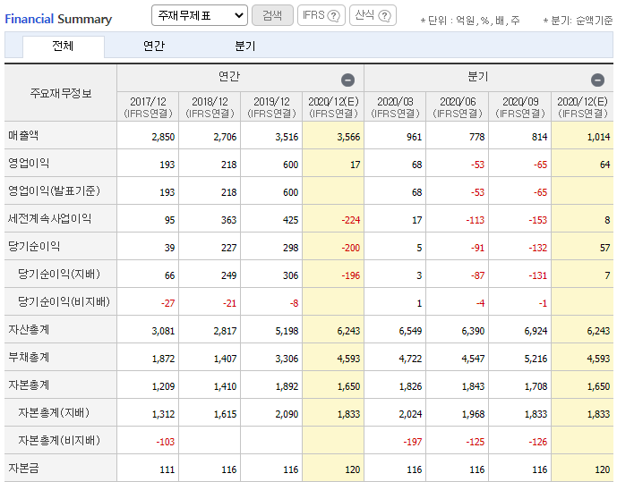 2020년 예상 매출액 3,566억원, 영업이익 17억원, 당기순이익 -200억원