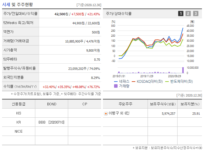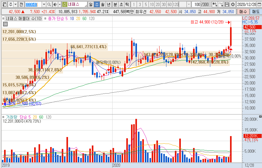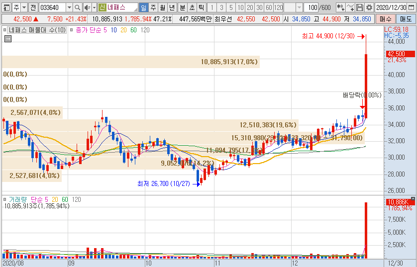 박스권을 오가던 주가는 10월 말 26,000원대의 저점의 가격을 기록한 이후 천천히 우상향 하여, 2020년 마지막 거래일에 급등을 하며 마친 네패스의 주가입니다.