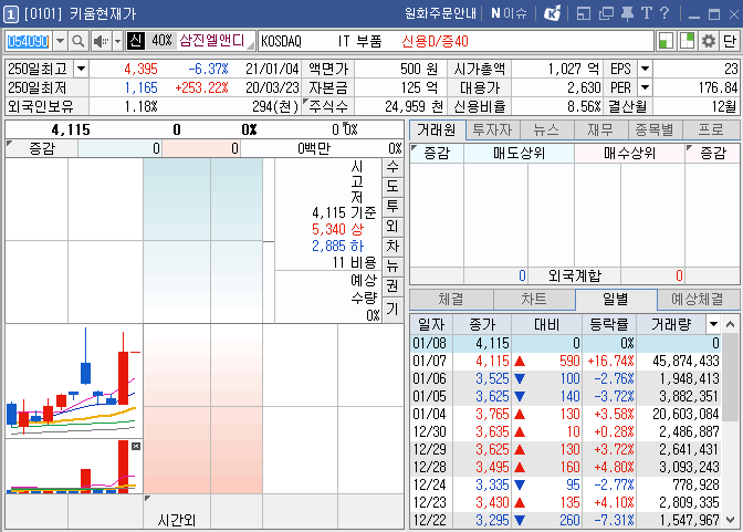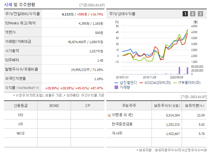 1월 7일 거래량은 45,874,433주를 기록하면서 16.74% 상승한 4,115원에 종가 마감하였습니다.