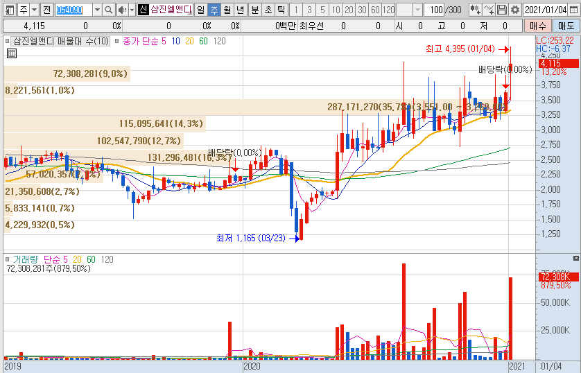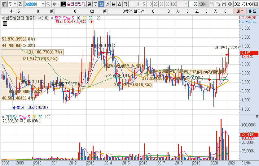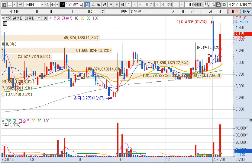 10월 말 2700원대의 저점을 기록한 이후 상승한 주가는 오르락 내리락 부침이 심한 모습을 보여주면서 4000원대에 안착한 가격대를 보여주고 있는 삼진엘앤디의 주가입니다.