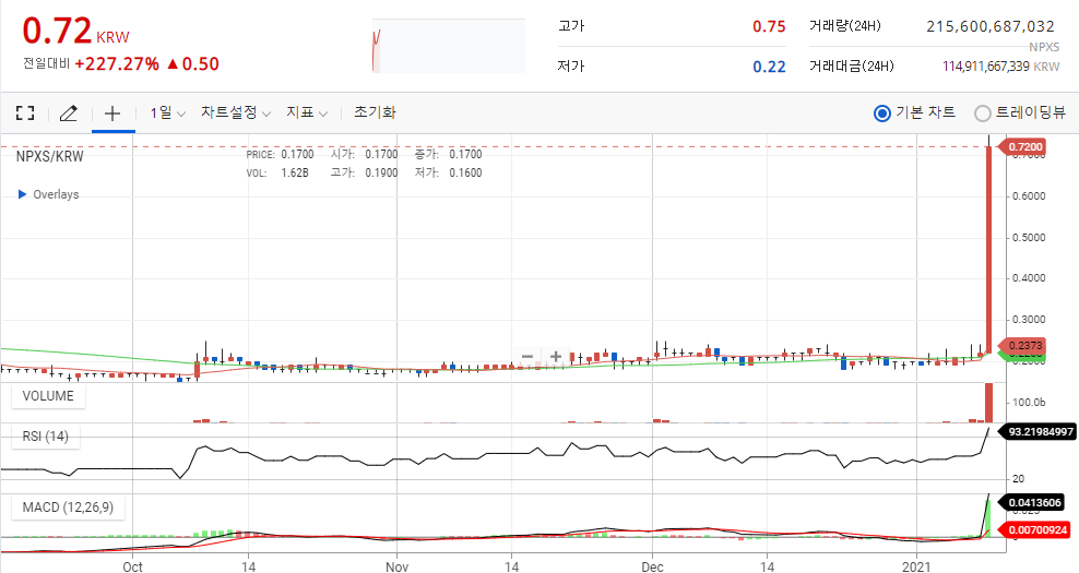 0.2원대에서 오랜동안 박스권을 유지하고 있던 펀디엑스의 시세가 1월 9일 폭발하면서 현재 0.7원이 넘는 시세를 보여주고 있습니다.