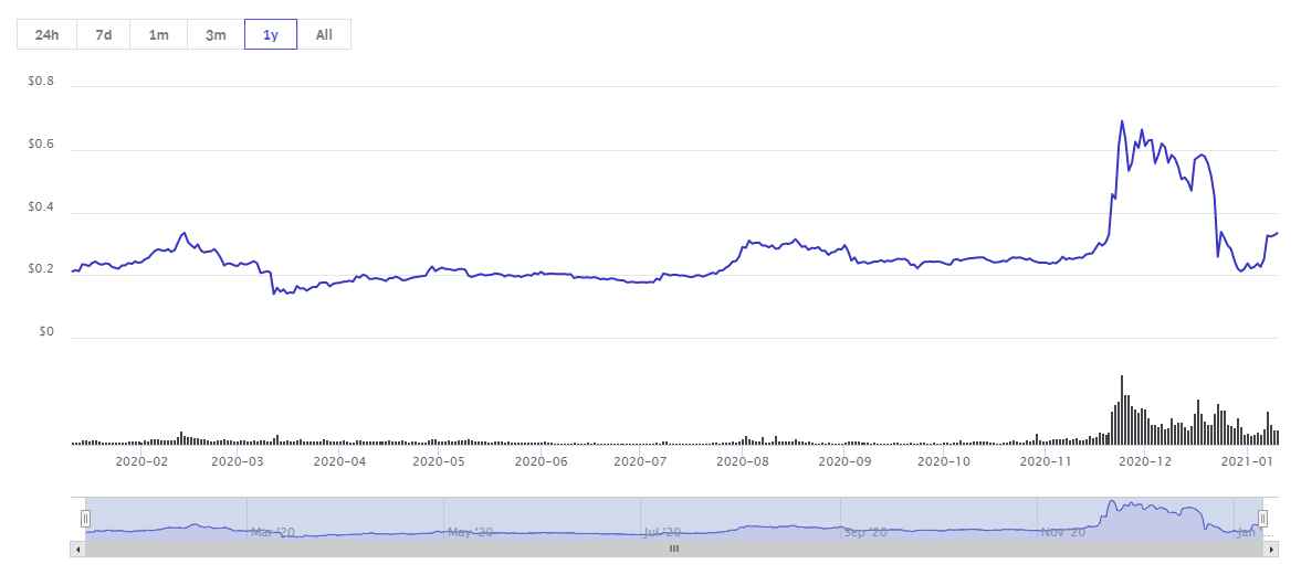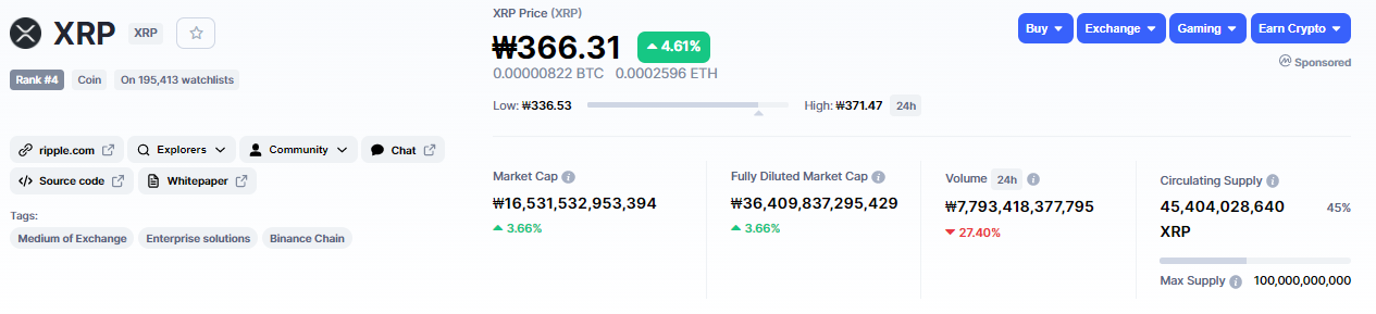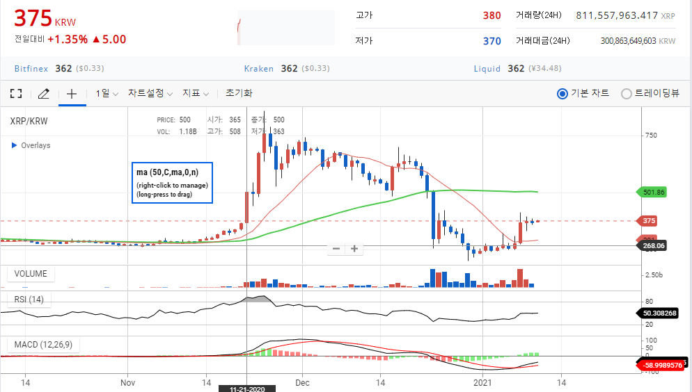 2020년 12월 29일 198원까지 폭락한 리플은 1월 7일 반등에 성공하며 현재 375원의 시세를 보여주고 있습니다.