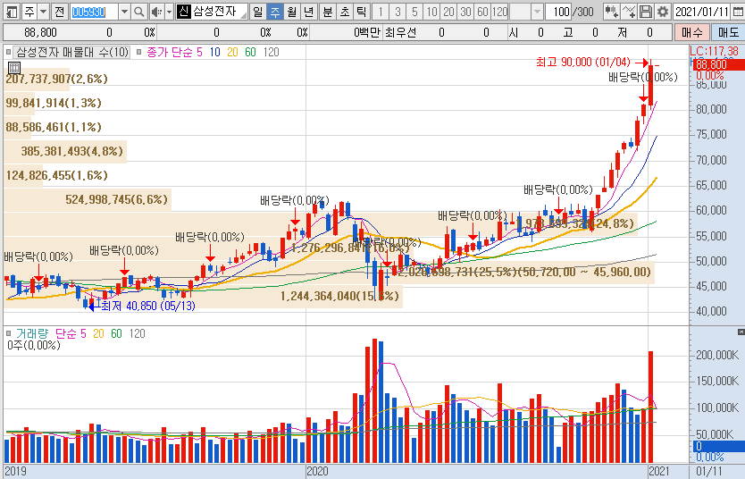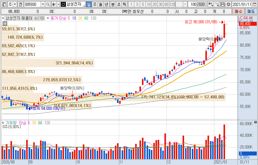 2020년 11월 2일 5.6만원대의 단기 저점을 확인 한 후 우상향 하기 시작한 주가는 2개월 뒤 무려 9만원까지 터치하면서 끝없이 상승하고 있는 삼성전자의 주가입니다.
