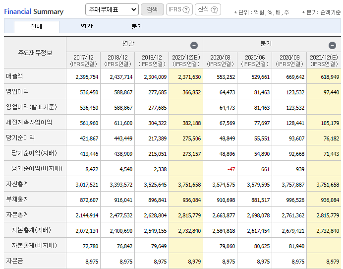 2020년 코로나로 힘든 한해를 보냈지만, 2019년에 비해 실적이 좋아질 것으로 전망 됩니다.