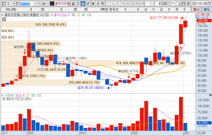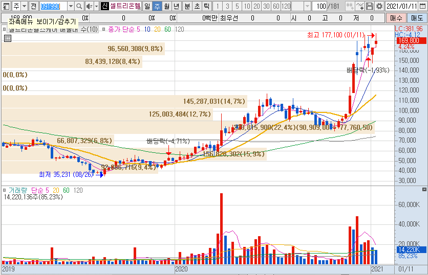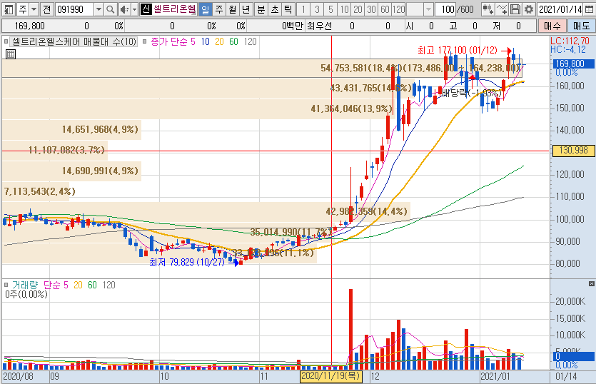 10월말 8만원에 조금 미치지 못한 가격으로 저점을 찍은 이후 꾸준히 상승한 가격대는 1월 중순 17만원대의 고점을 찍은 뒤 16만원 후반대를 기록중인 셀트리온헬스케어의 주가입니다.