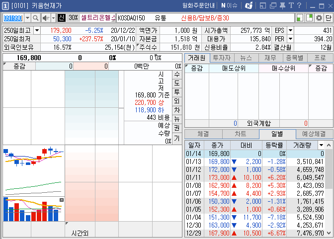 250일 최고가는 2020년 12월 22일 기록한 179,200원이고, 250일 최저가는 2020년 1월 10일 기록한 50,300원으로 최저가 대비 현 주가는 237.57% 상승한 수치입니다.