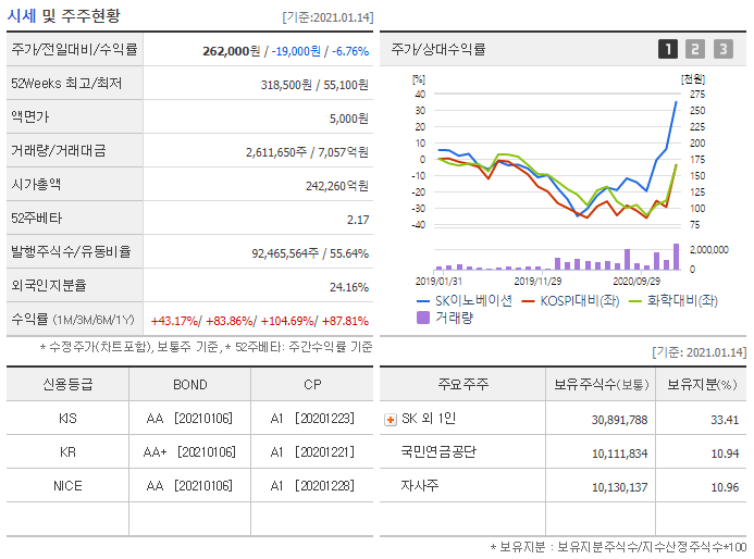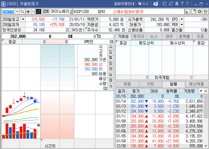 11월 초 11만원대의 저점을 기록한 이후 꾸준히 상승하던 가격대는 1월 11일 31만원대의 고점을 찍은 이후 하락추세로 전환하여 현재 26만원대 가격대를 보이고 있는 SK이노베이션의 주가입니다.