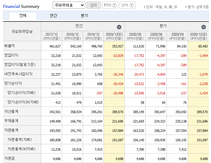 2020년은 전년도에 비해 매출액도 줄어들고, 실적도 적자로 전환 될 것으로 전망됩니다.
