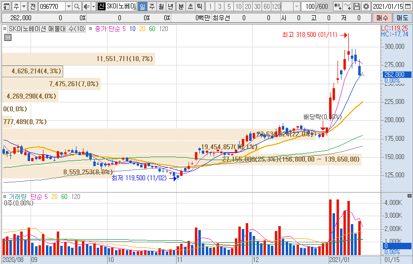 1월 14일 거래량은 2,611,650주를 기록하면서 -6.76% 하락한 262,000원에 종가 마감하였습니다.