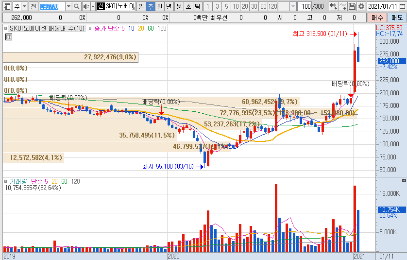 250일 최고가는 2021년 1월 11일 기록한 318,500원이고, 250일 최저가는 2020년 3월 19일 기록한 55,100원으로 최저가 대비 현 주가는 375.50% 상승한 수치입니다.