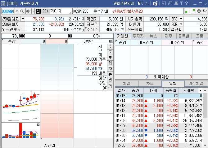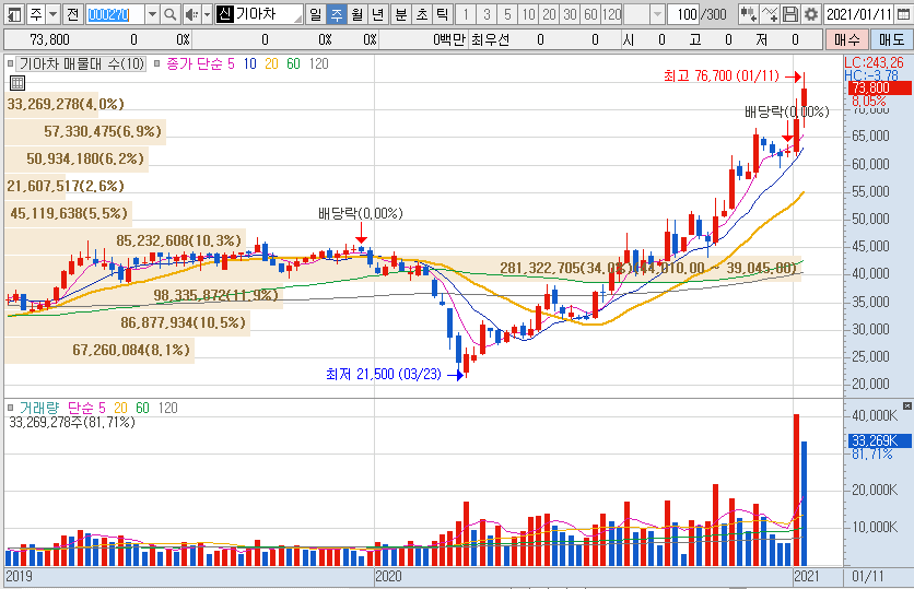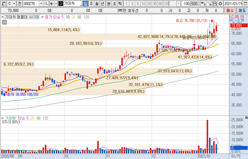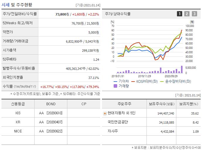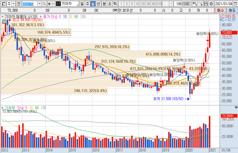 8월 20일 3.9만원대의 저점이후 꾸준히 상승하던 주가는 1월 13일 7.6만원대의 고점을 기록하고 현재는 7.3만원대 가격을 유지중인 기아차의 주가입니다.
