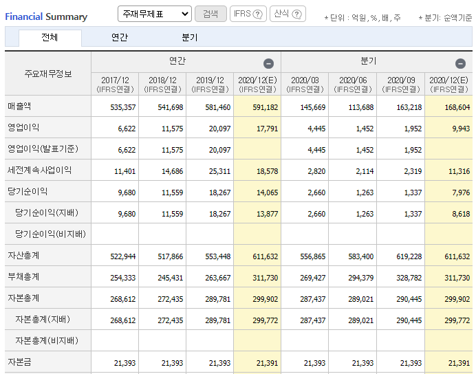 2020년 실적은 2019년에 비해 실적이 떨어지는데, 코로나 상황임을 감안하면 나름 선방한 실적을 보여줄 예상입니다.