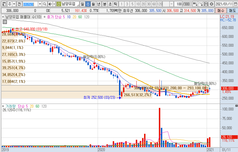 9월 말 25만원대의 저점을 기록한 이후 꾸준히 우상향한 가격대는 어느덧 30만원을 넘어서 31만원대의 가격대를 기록중인 남양유업의 주가입니다.