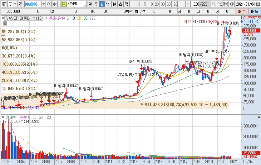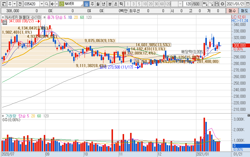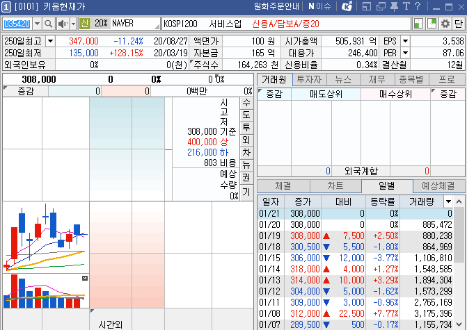 1월 20일 거래량은 885,472주를 기록하면서 전일과 동일한 308,000원에 종가 마감하였습니다.