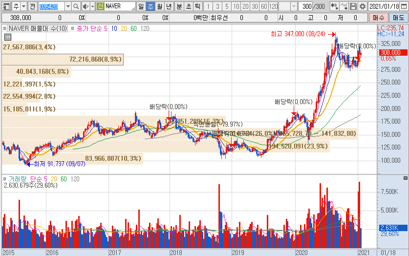 11월 중순 27만원대의 저점을 기록한 이후 현재까지 박스권을 오가며 30만원대의 가격에 거래가 되고 있는 네이버의 주가입니다.