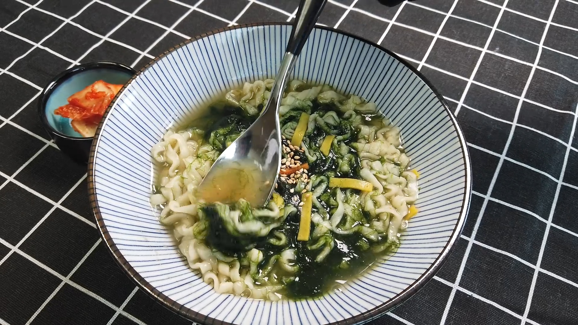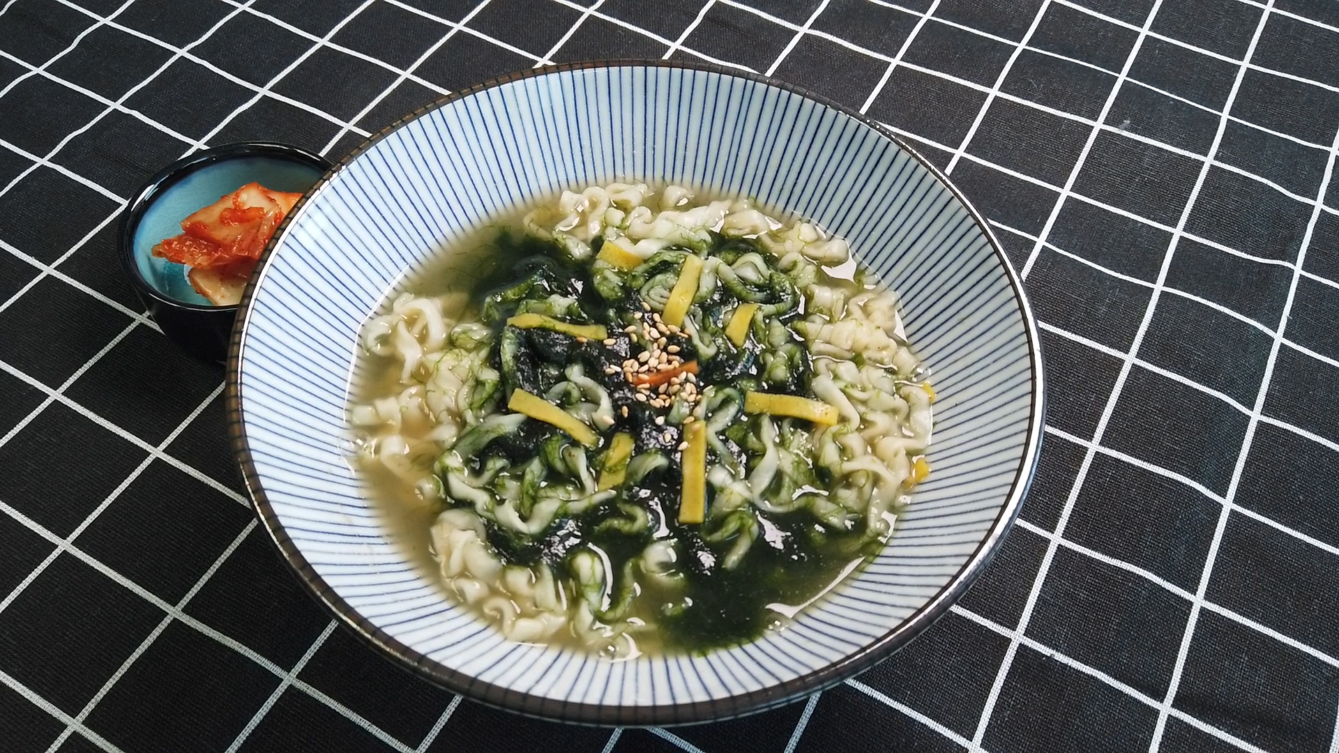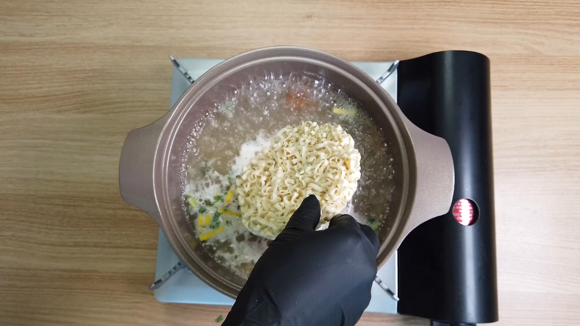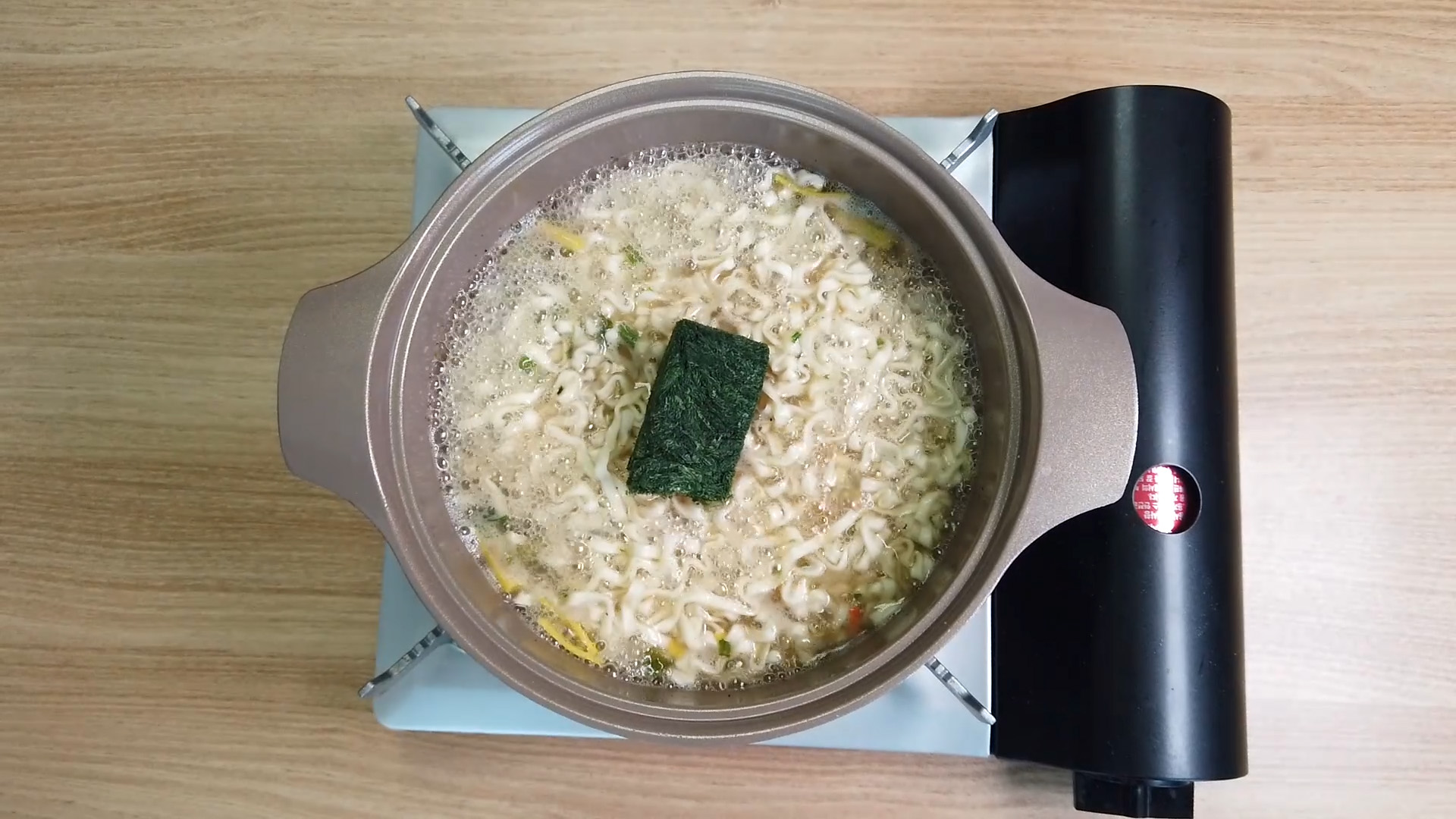 면이 다 익기 1분 전에 매생이 블럭을 1개 넣어줍니다.