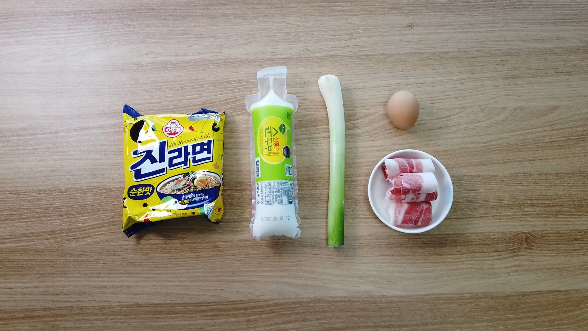 라면, 순두부, 대파, 돼지고기, 계란입니다.