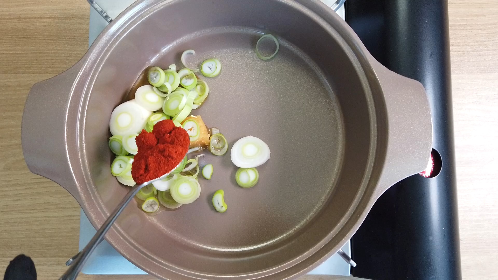참기름 1스푼, 식용유 1스푼, 다진마늘 1스푼, 고추가루 1스푼, 대파를 넣어줍니다