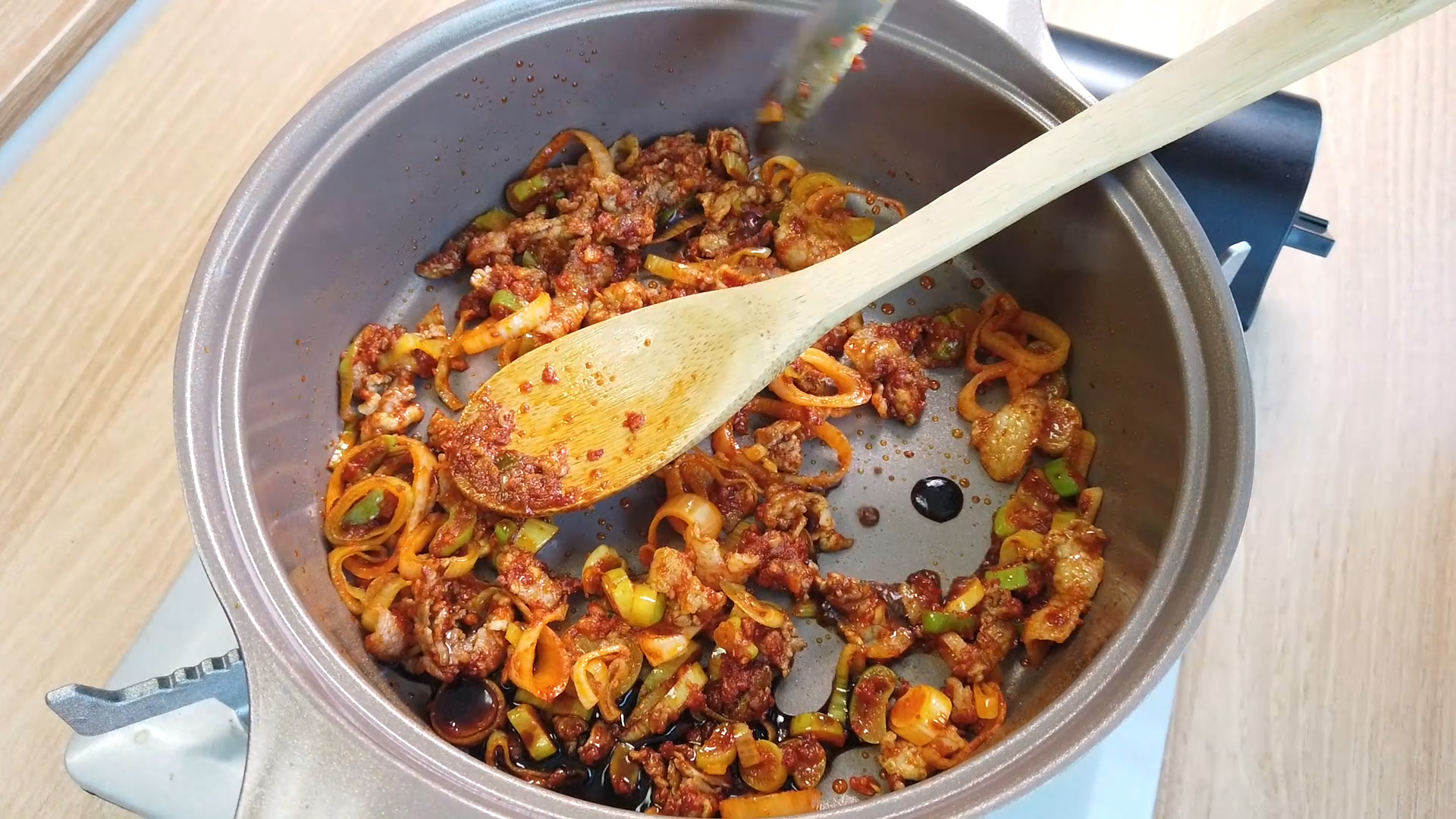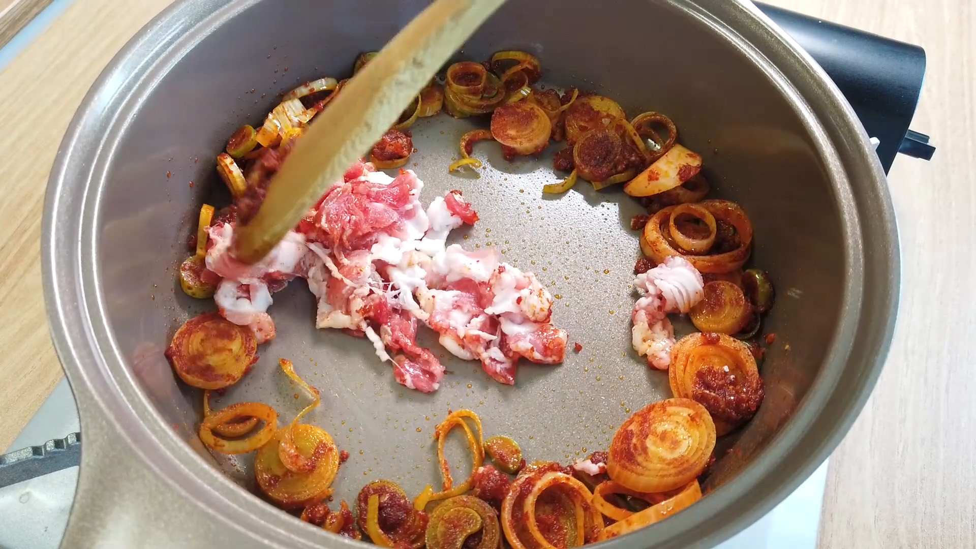 대파향이 솔솔 올라오면 돼지고기를 넣고 볶아줍니다.